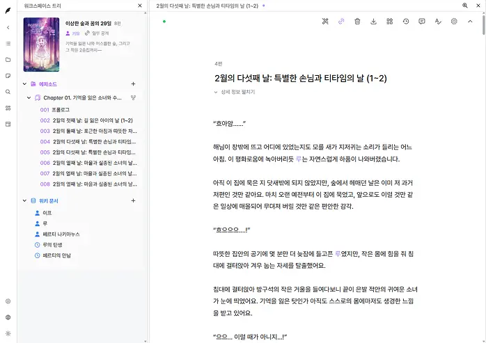 화면 하나에 여러 정보를 띄워 집필하는 걸 선호하는 작가님들을 위한 고급 에디터예요. 화면을 분할해서 원하는 위치에 에피소드, 위키, 메모 보드 등 문서를 배치하고 크기를 자유롭게 조정할 수 있어요.